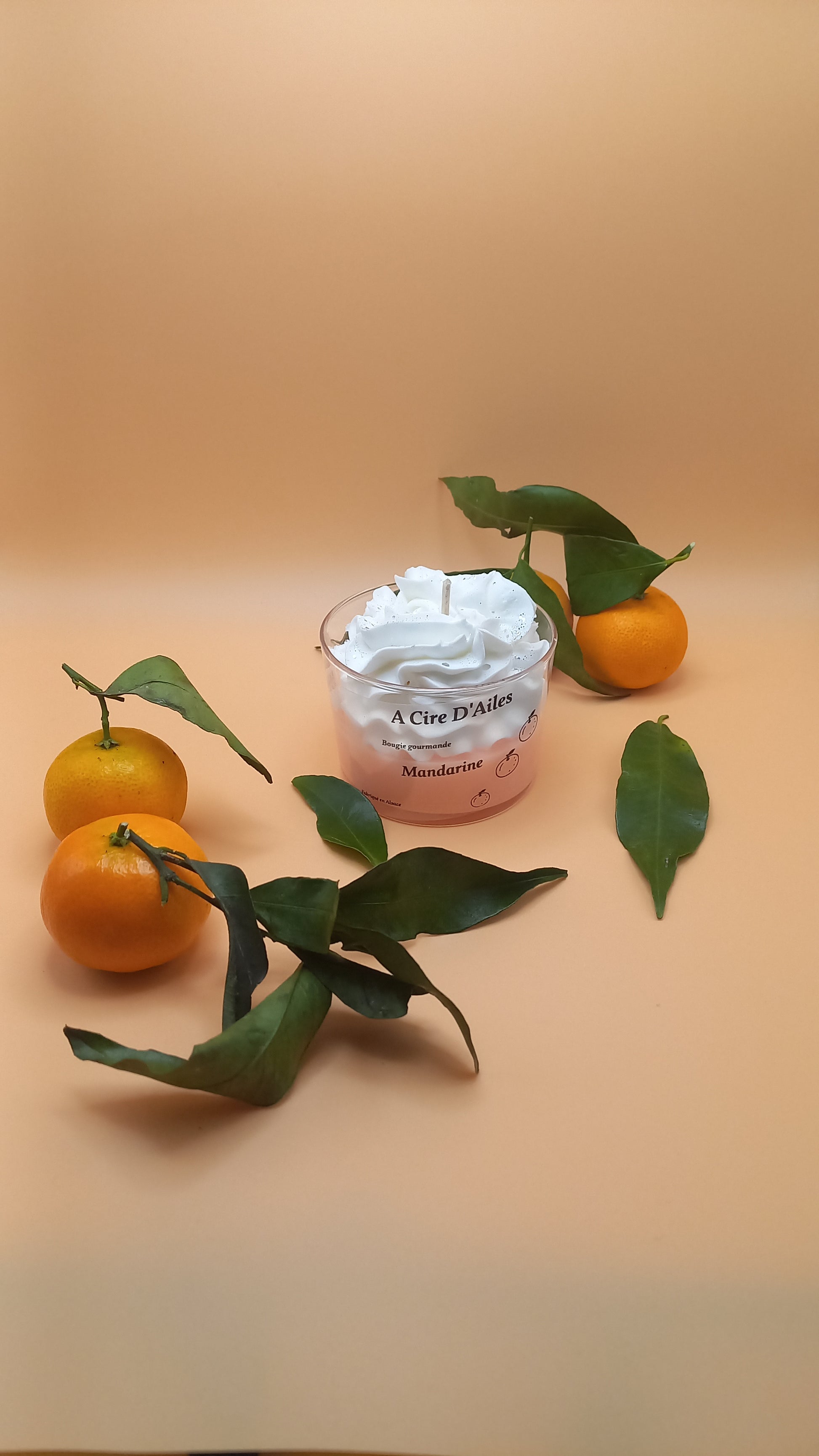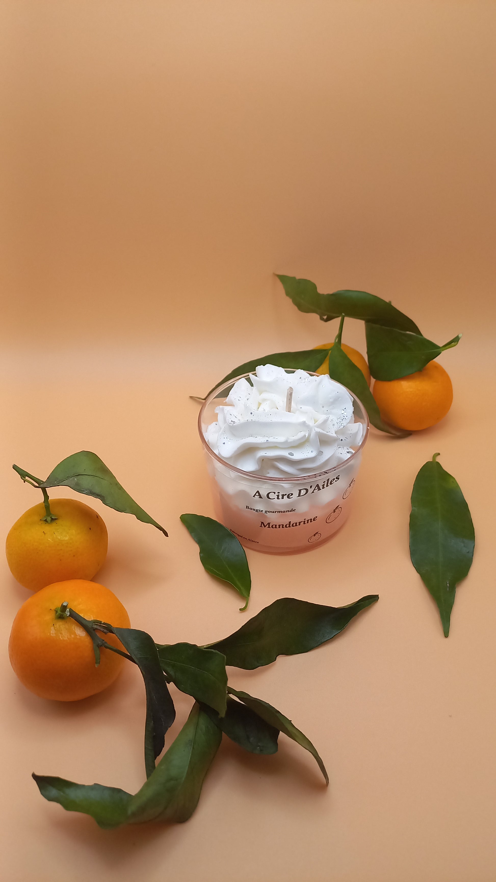 Bougie parfum mandarine avec sa chantilly pailletée.