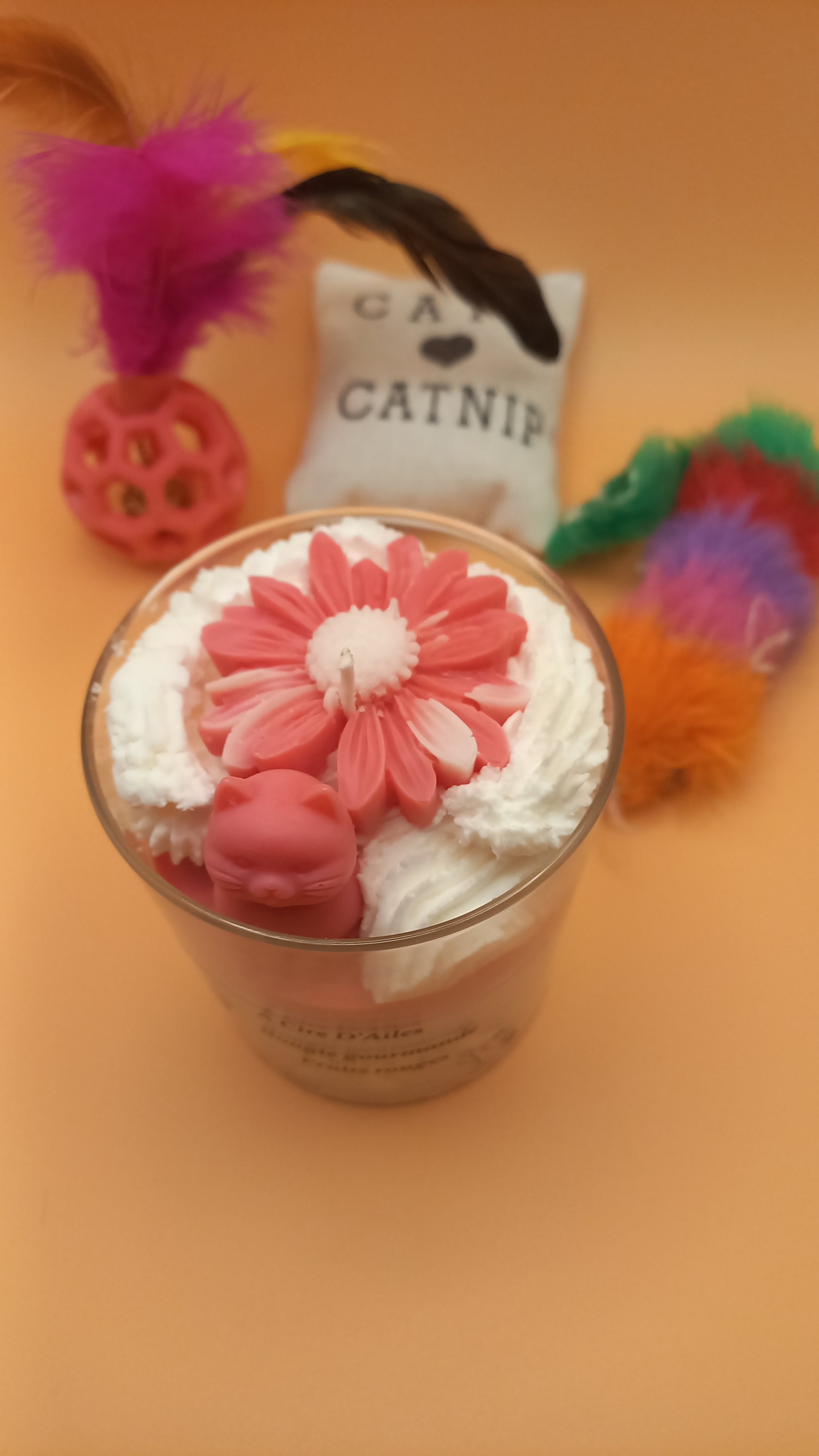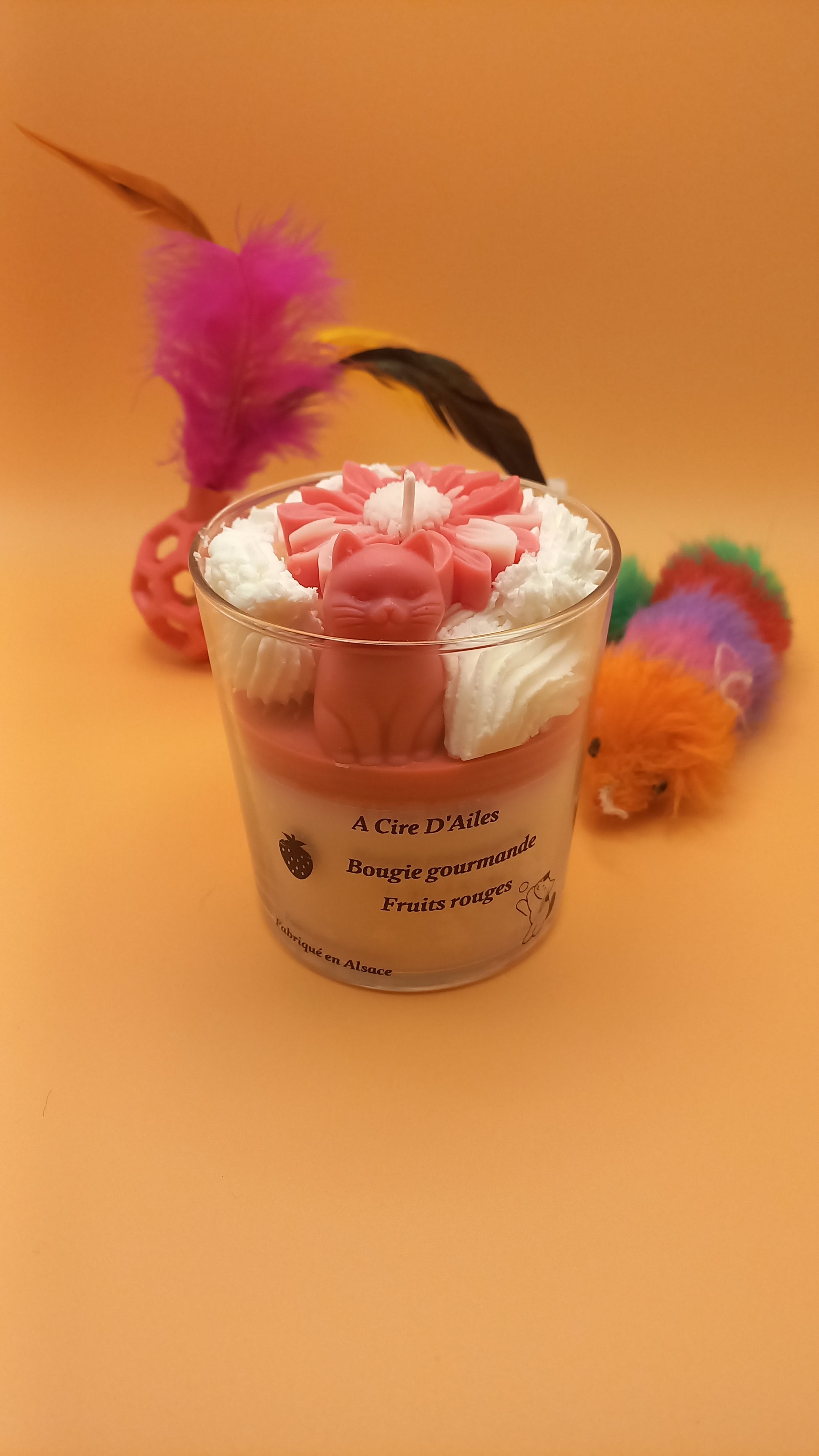 Bougie parfum rouge de fruits. Avec son petit chat et sa fleur.