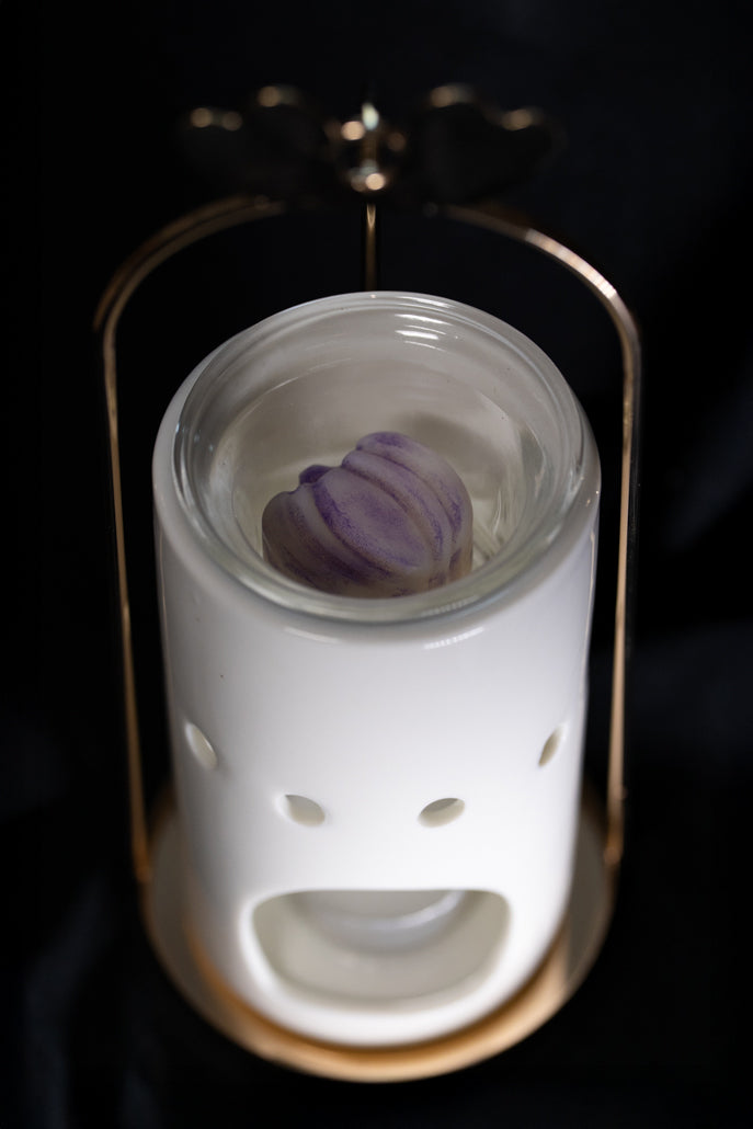 Joli brûleur en ciment blanc et métal dans sa cage dorée et agrémentée de 2 cœurs entrelacés doré.
