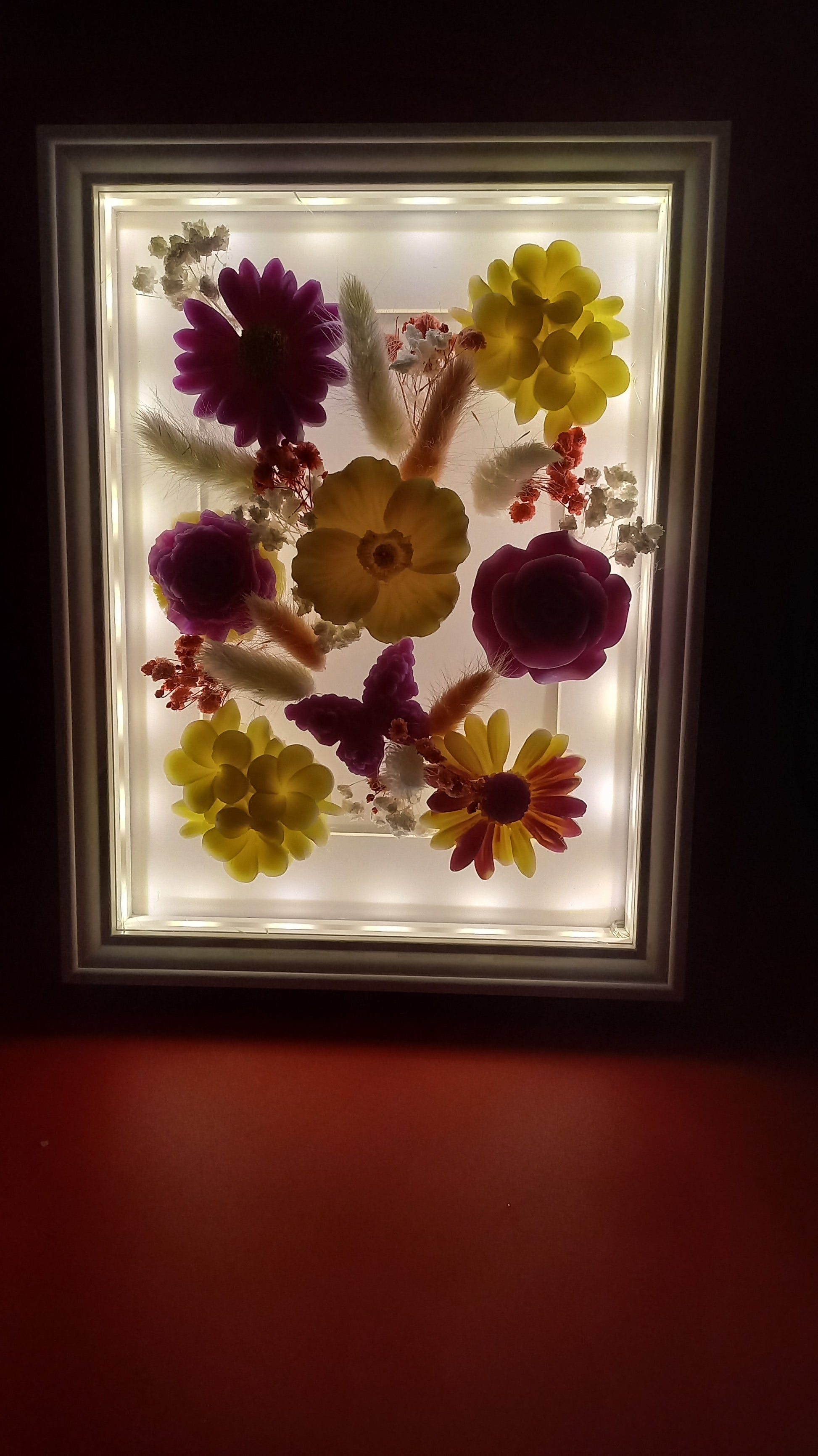 Je vous propose ce cadre lumineux modèle unique qui en impose avec ses 8 fondants au parfum rose éternelle.