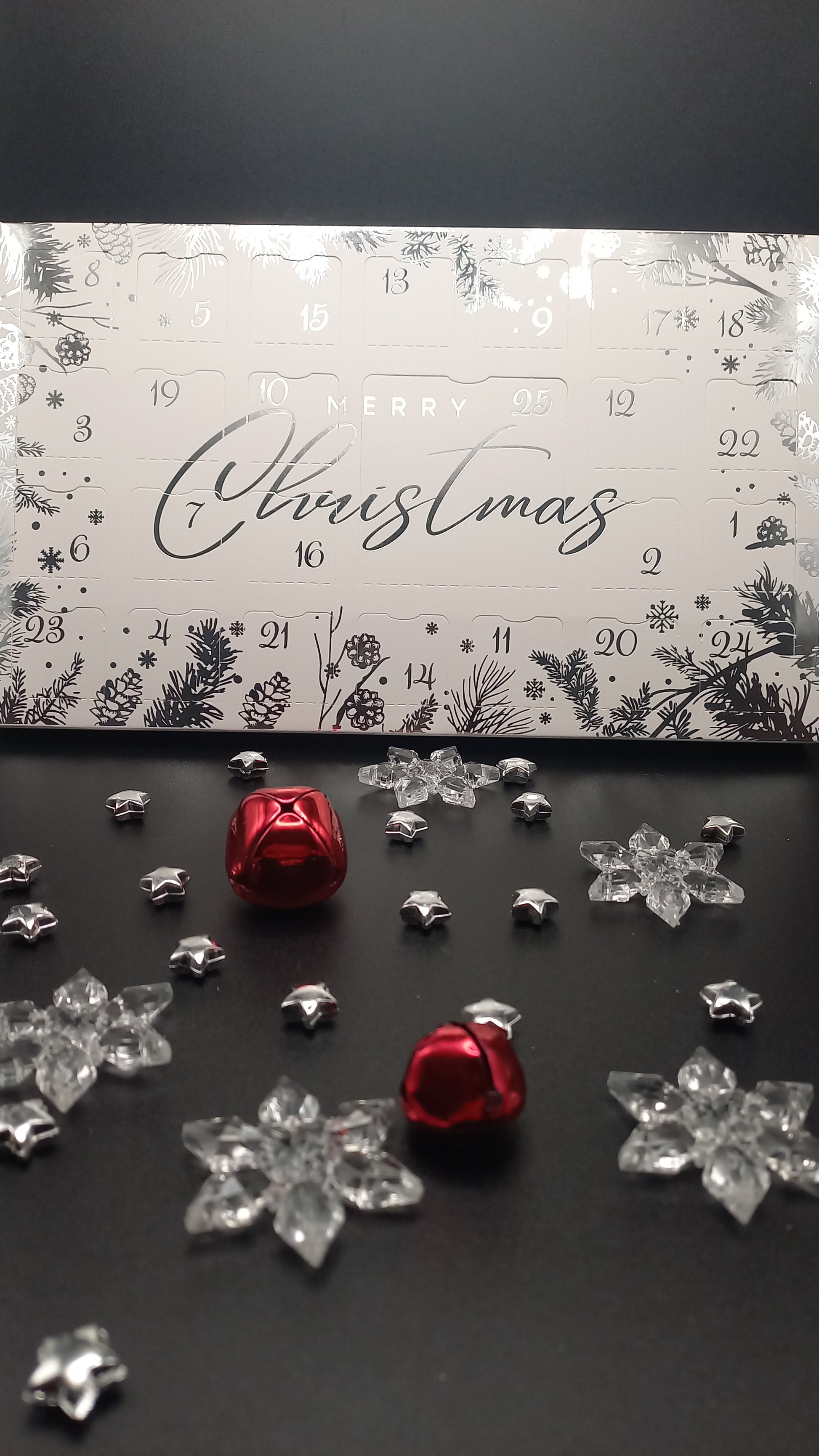 Joli calendrier de l'avent au décor blanc et argenté, chic et raffiné. pour un décompte parfumé jusqu'à Noël.