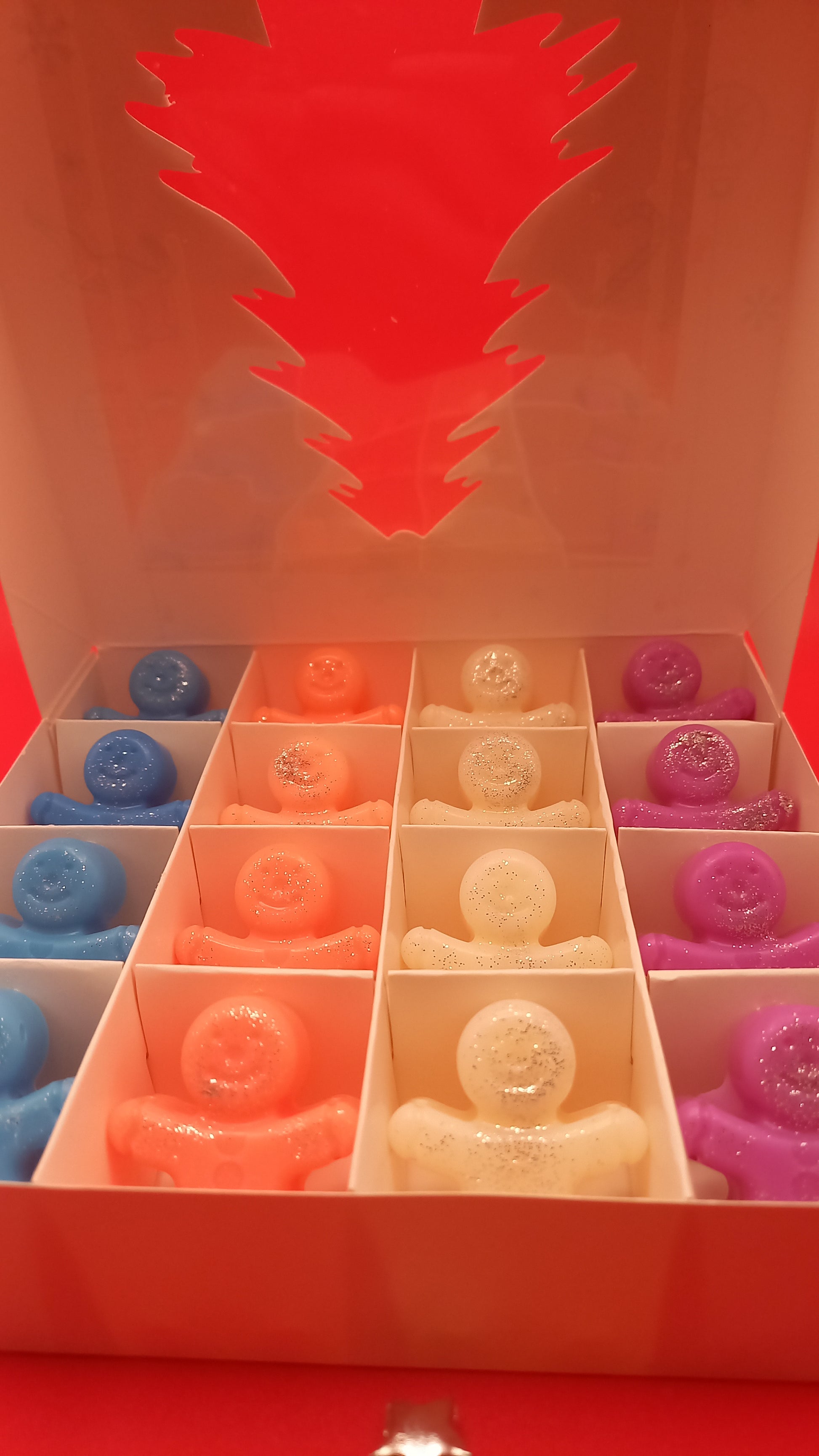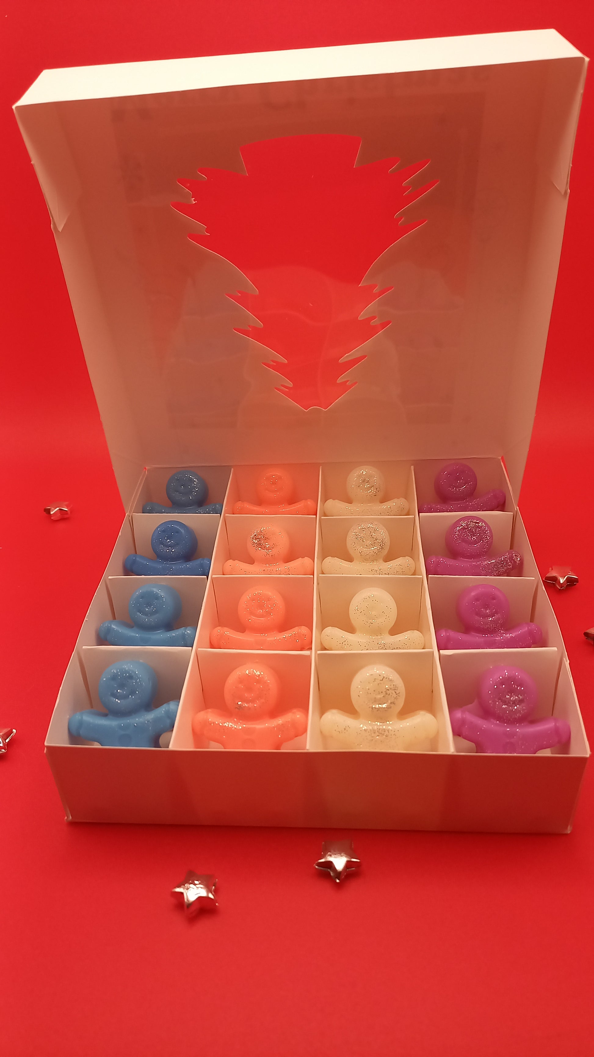 Jolie coffret de fondants en forme de ''Mannele'' ou petit bonhomme aux parfums clair de lune, mandarine, pets de singe et pain d'épice et figue.