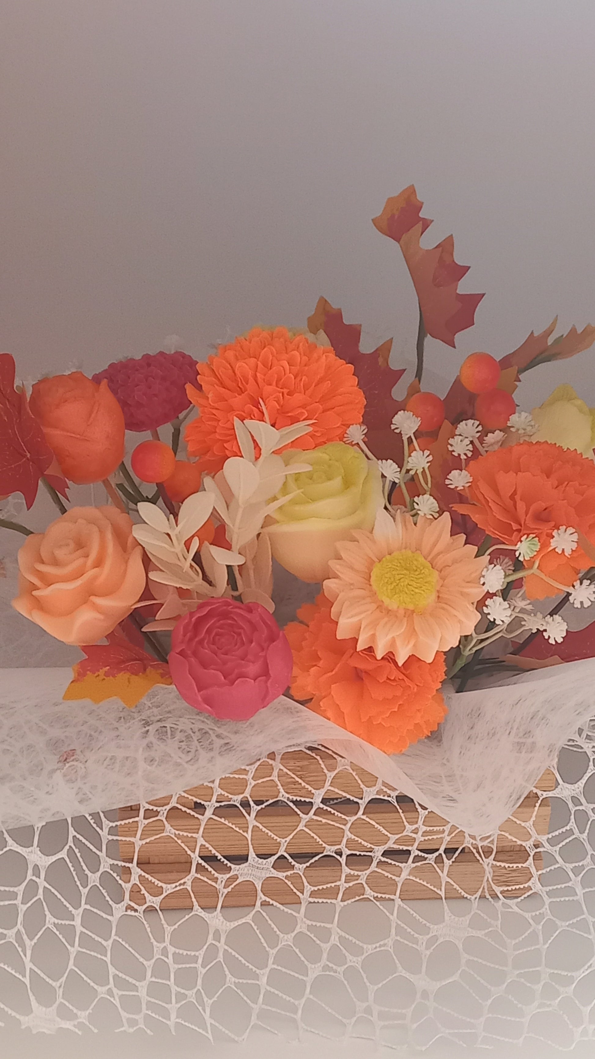Joli composition aux couleurs automnales parfum clair de lune, ce compose d'un magnifique bouquet de fleurs, assorti aux feuilles et ornements artificiels.