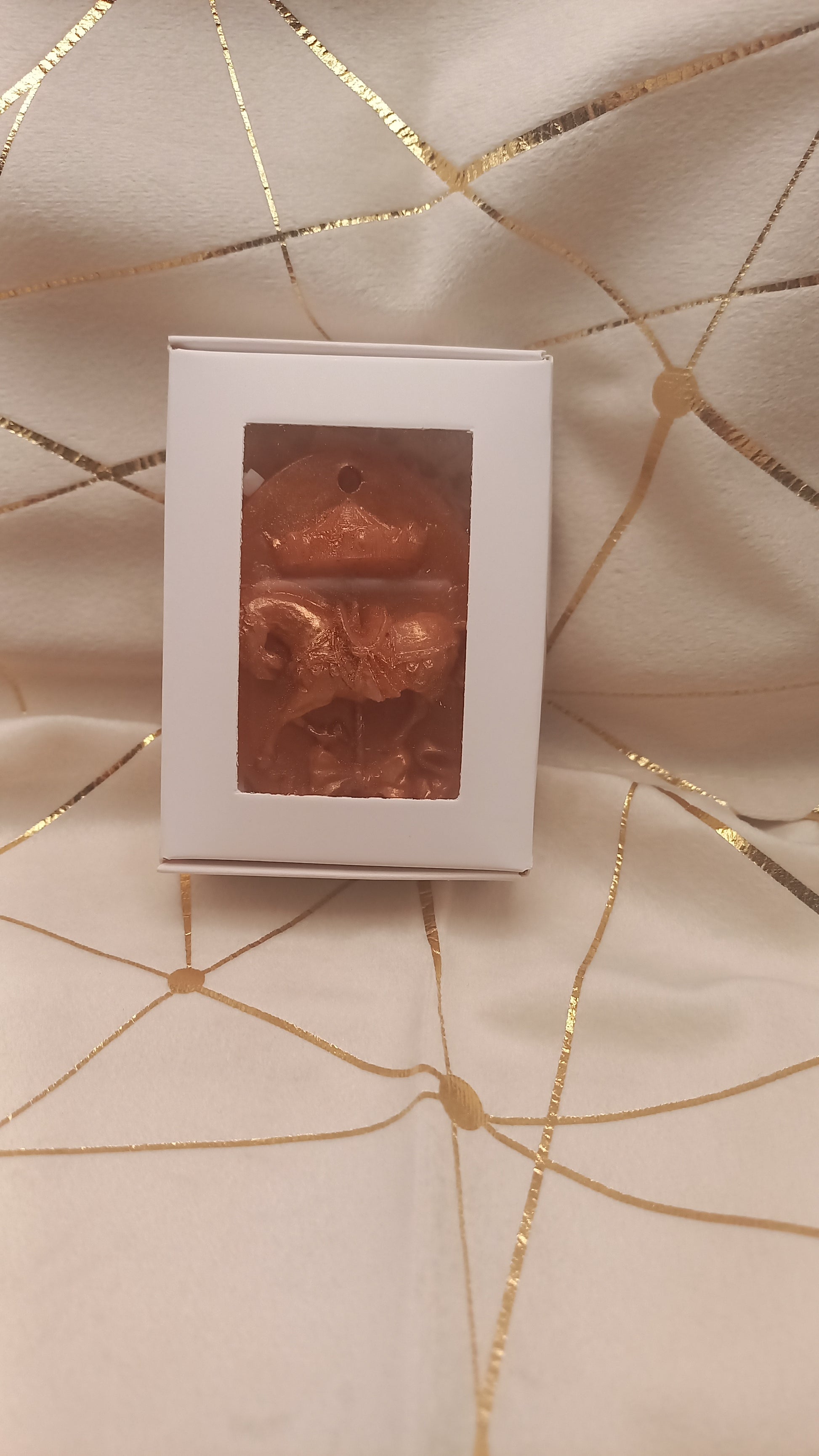 Joli petite Joli médaillon carrousel au parfum caramel crémeux dans sa petite boîte prête à offrir en présent sur une table pour vos invités lors des fêtes de Noël grâce a sa couleur festive en bronze.