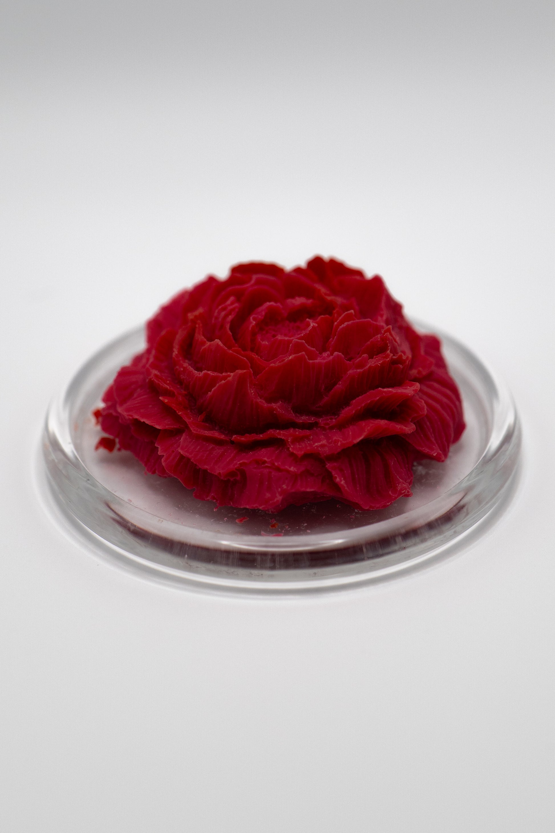 Fondant parfum rose éternelle (couleur rouge) et parfum couronne de gui (couleur bronze) en forme de pivoine.