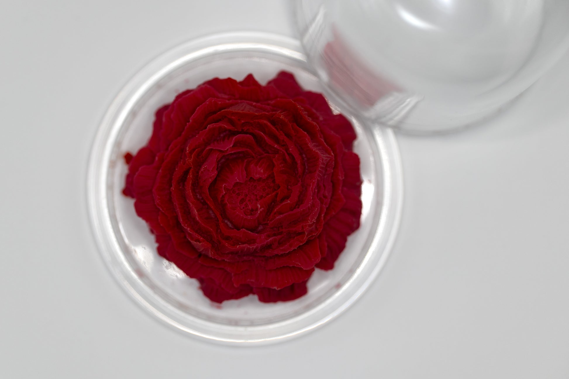 Un sublime fondant sous forme de pivoine rouge aux milles pétales,ou de couleur bronze selon le parfum, et bien mis en valeur dans sa jolie cloche en verre.