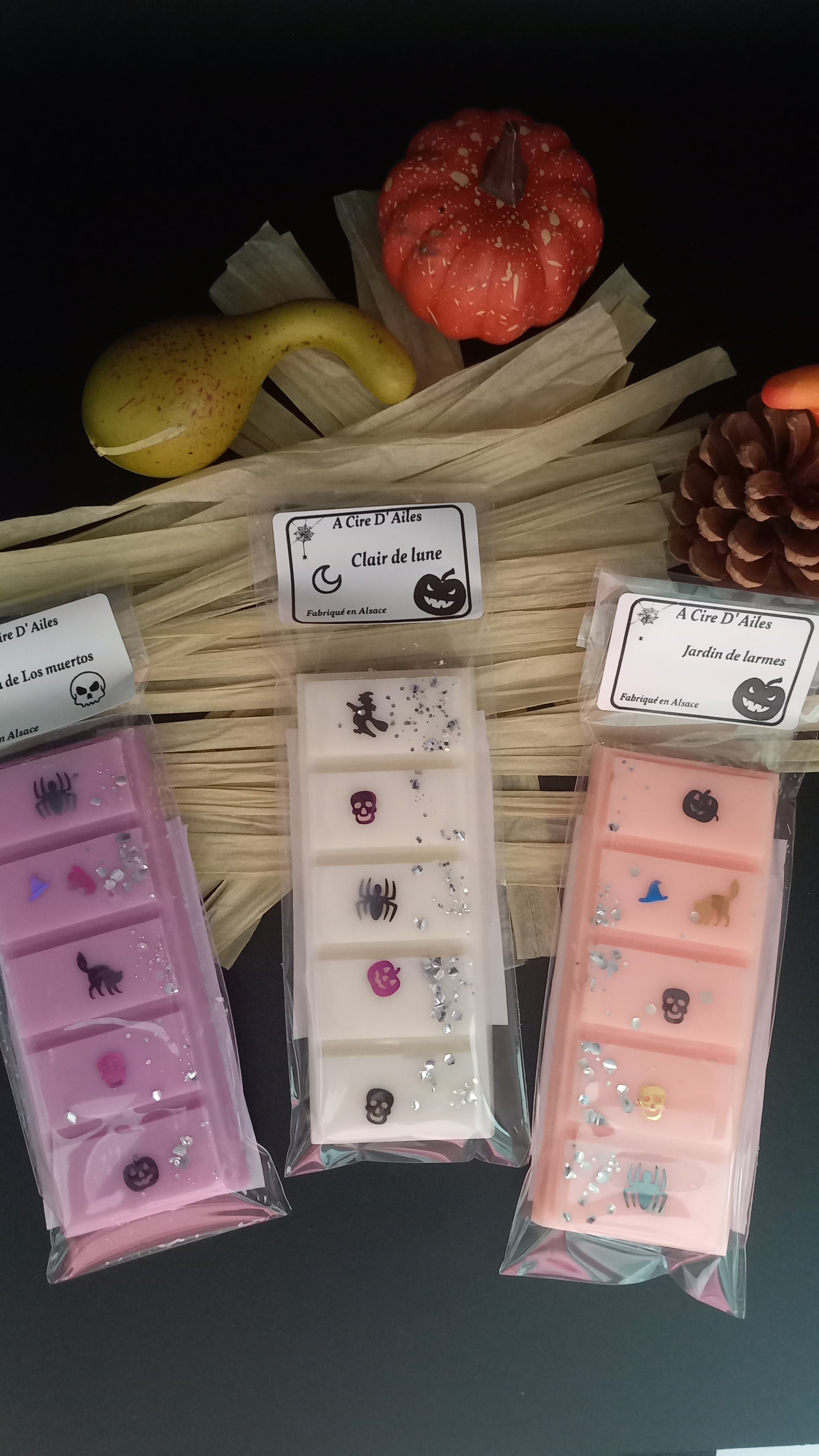 Fondants parfums Dia de los muertos, clair de lune et jardin de larmes en forme de tablette.